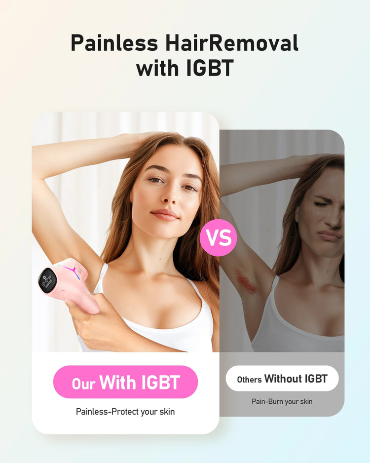[Nearly Painless Hair Removal at home] Double IGBT pulse technology and realize 0.12S fast flash can deliver two consecutive pulses, reduces the pain caused by a single energy to achieve painless hair remover, max 22J can deep reach and accumulate target hair follicle melanin to fast and effeive removing.